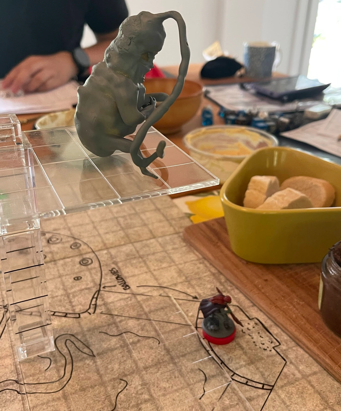 The battle turns brutal. The abomination hammers them. The tentacles, immune to physical damage, lash out relentlessly. Krariak tries to destroy the struts but is unable to make a dent, attacking them with physical damage. Sophi explores the adjoining balconies but finds nothing other than a lot of little containers spread everywhere. Meanwhile, the rest of the party bombards the abomination and Soulmonger with fireballs, moonbeams, and lightning arrows.
